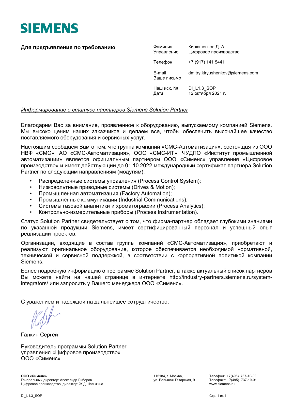 Официальные партнерские сертификаты Siemens Solution Partner Automation Drives Партнерский сертификат Siemens Solution Partner Chemical Партнерский сертификат Siemens Solution Partner Drives & Motion Партнерский сертификат Siemens Solution Partner Factory Automation