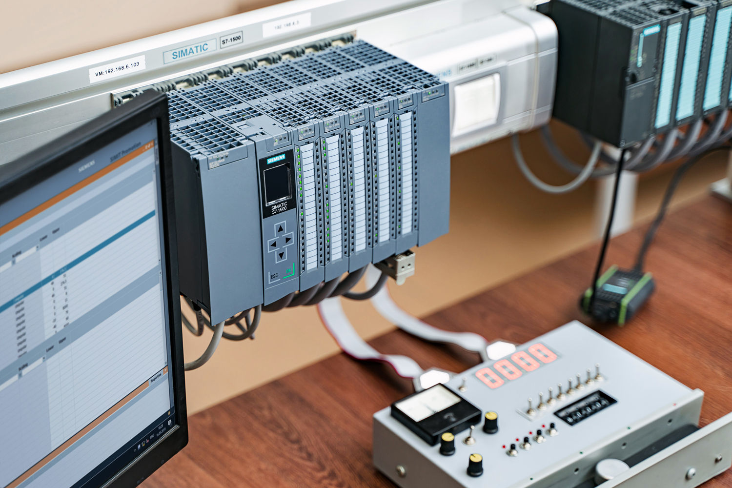 Оборудование курса: многофункциональный стенд на основе контроллера Simatic S7-1500, TIA Portal v16, человеко-машинный интерфейс на основе WinCC Runtime, конвейерной ленты, местного пульта управления, включающего различные органы управления, дисплей, светодиодные индикаторы.